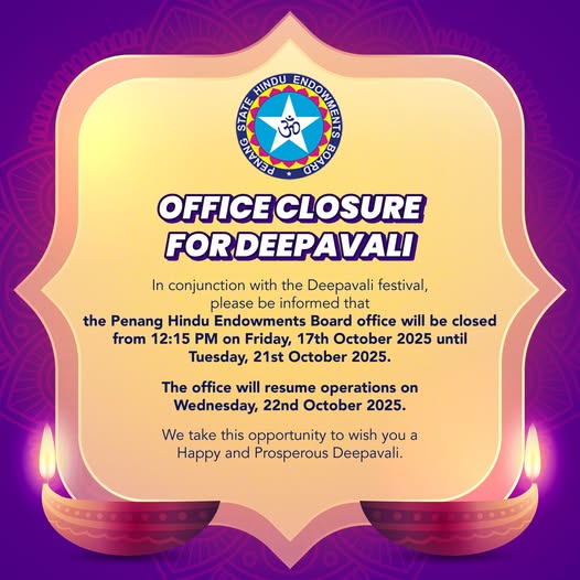 In conjunction with the Deepavali festival, please be informed that the Penang Hindu Endowments Board office will be closed from 12:15 PM on Friday, 17th October 2025 until Tuesday, 21st October 2025.