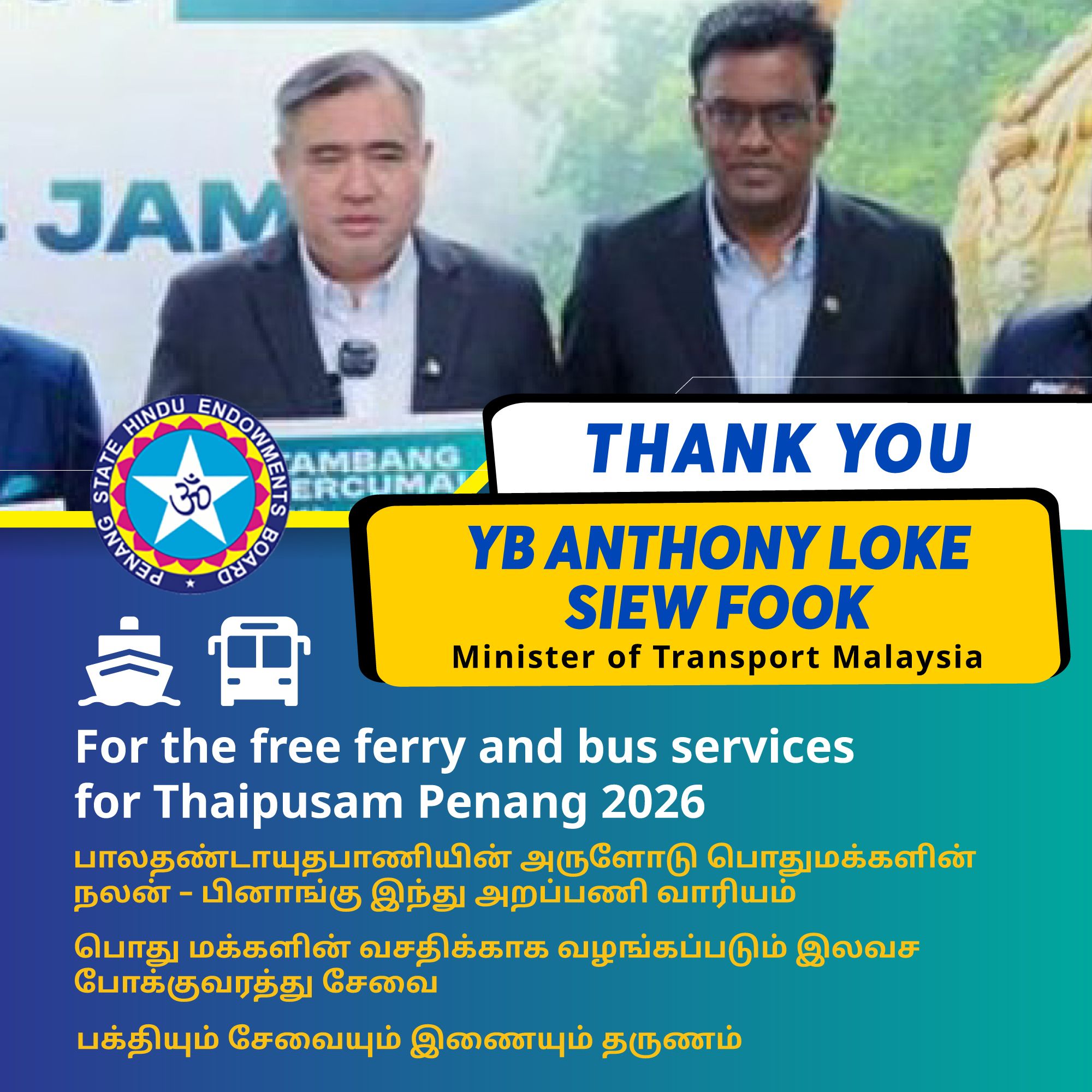 In conjunction with Thaipusam 2026, the Penang Hindu Endowments Board extends our heartfelt appreciation to the Minister of Transport, YB Anthony Loke, for approving FREE bus and ferry services for devotees and the public.