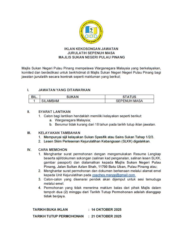 Permohonan adalah dipelawa daripada calon-calon warganegara Malaysia tidak kurang dari 18 tahun pada tarikh tutup iklan jawatan yang berkelayakan untuk mengisi kekosongan jawatan bertaraf KONTRAK di Majlis Sukan Negeri Pulau Pinang.