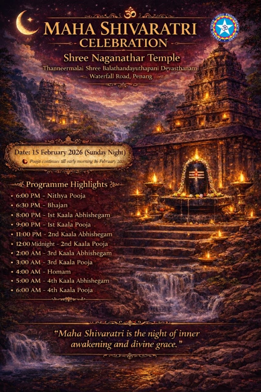 We welcome all devotees to join us for this sacred night of prayer, reflection, and divine blessings at Thanneermalai Shree Balathandayuthapani Devasthanam, Waterfall Road, Penang.