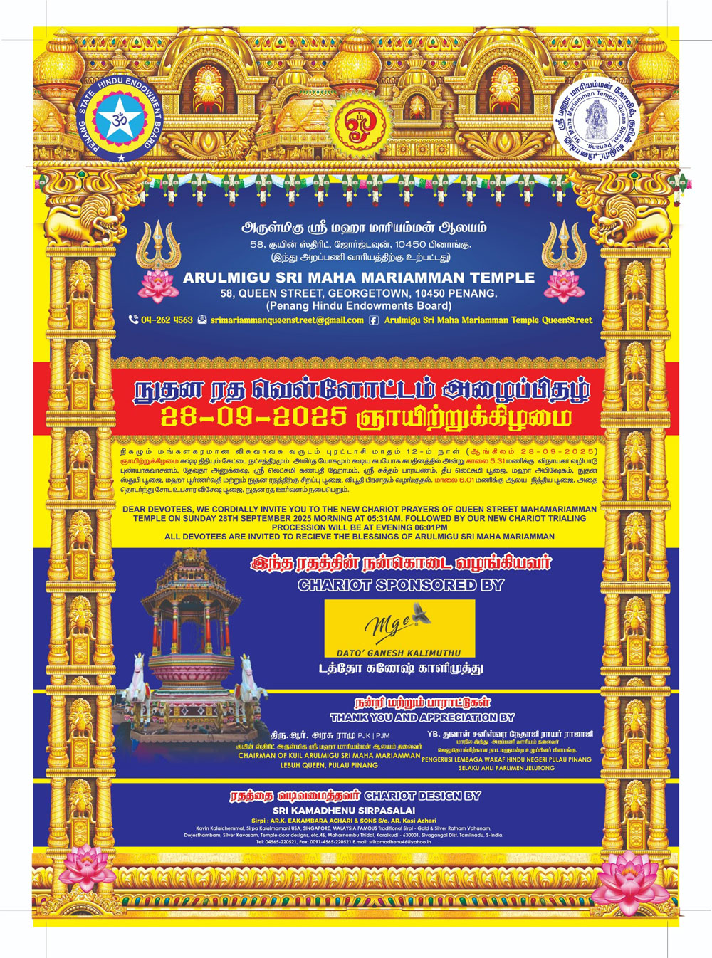 On Sunday, 28th September 2025, the temple will hold the New Chariot Prayers at 5:31 AM, followed by the Chariot Trialing Procession at 6:01 PM.