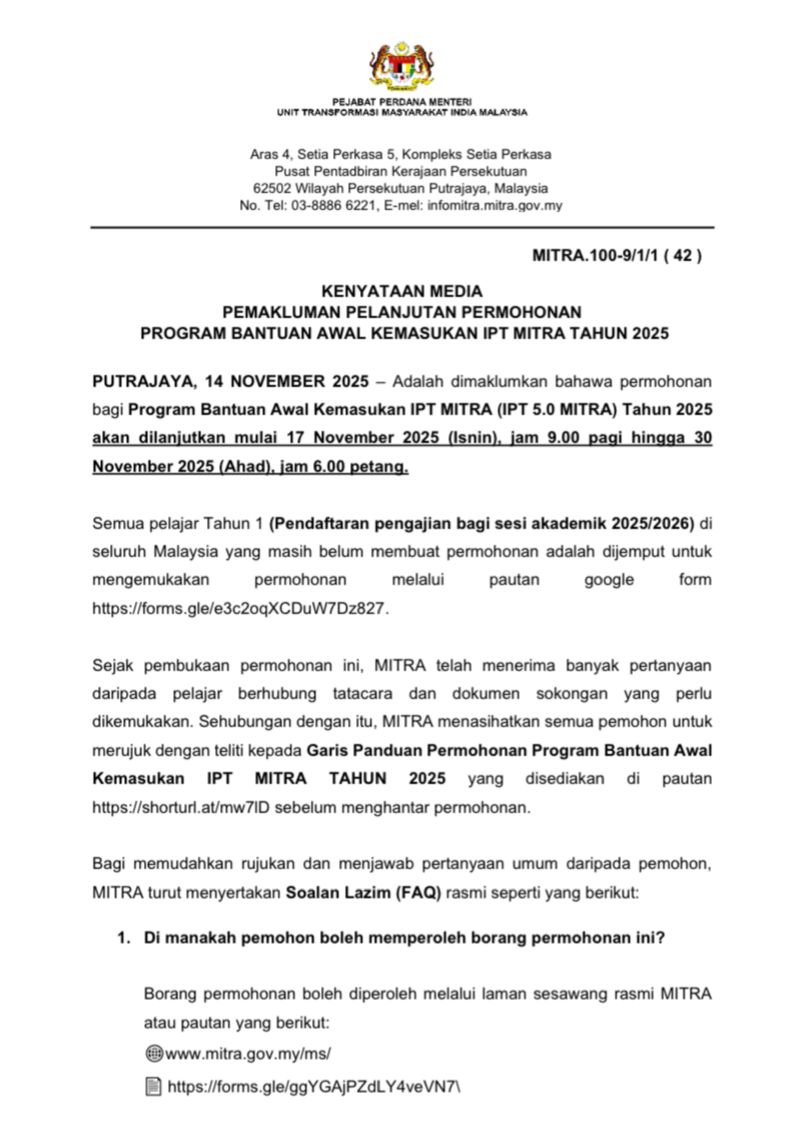 Kenyataan MediaPemakluman Pelanjutan PermohonanProgram Bantuan Awal Kemasukan IPT Mitra Tahun 2025 (IPT 5.0 Mitra)