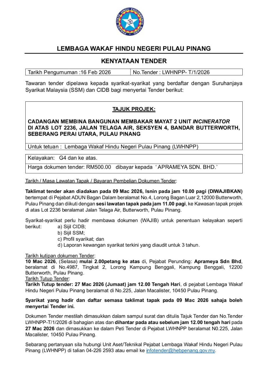 The Penang State Hindu Endowments Board is inviting qualified and registered contractors to participate in the following tender:
