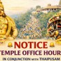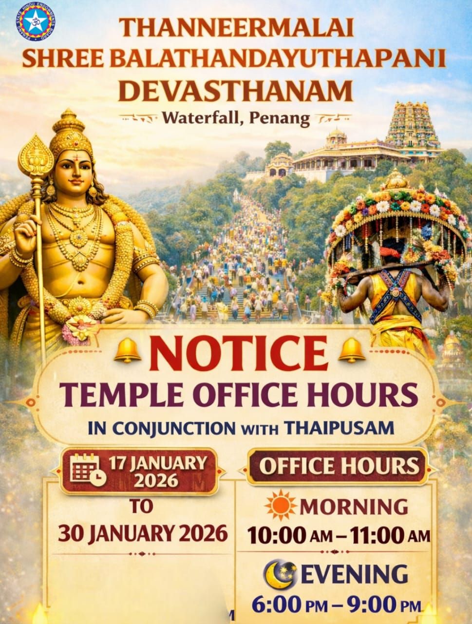 In conjunction with Thaipusam 2026, the office at Thanneermalai Shree Balathandayuthapani Devasthanam will operate on special hours from 17–30 January 2026.